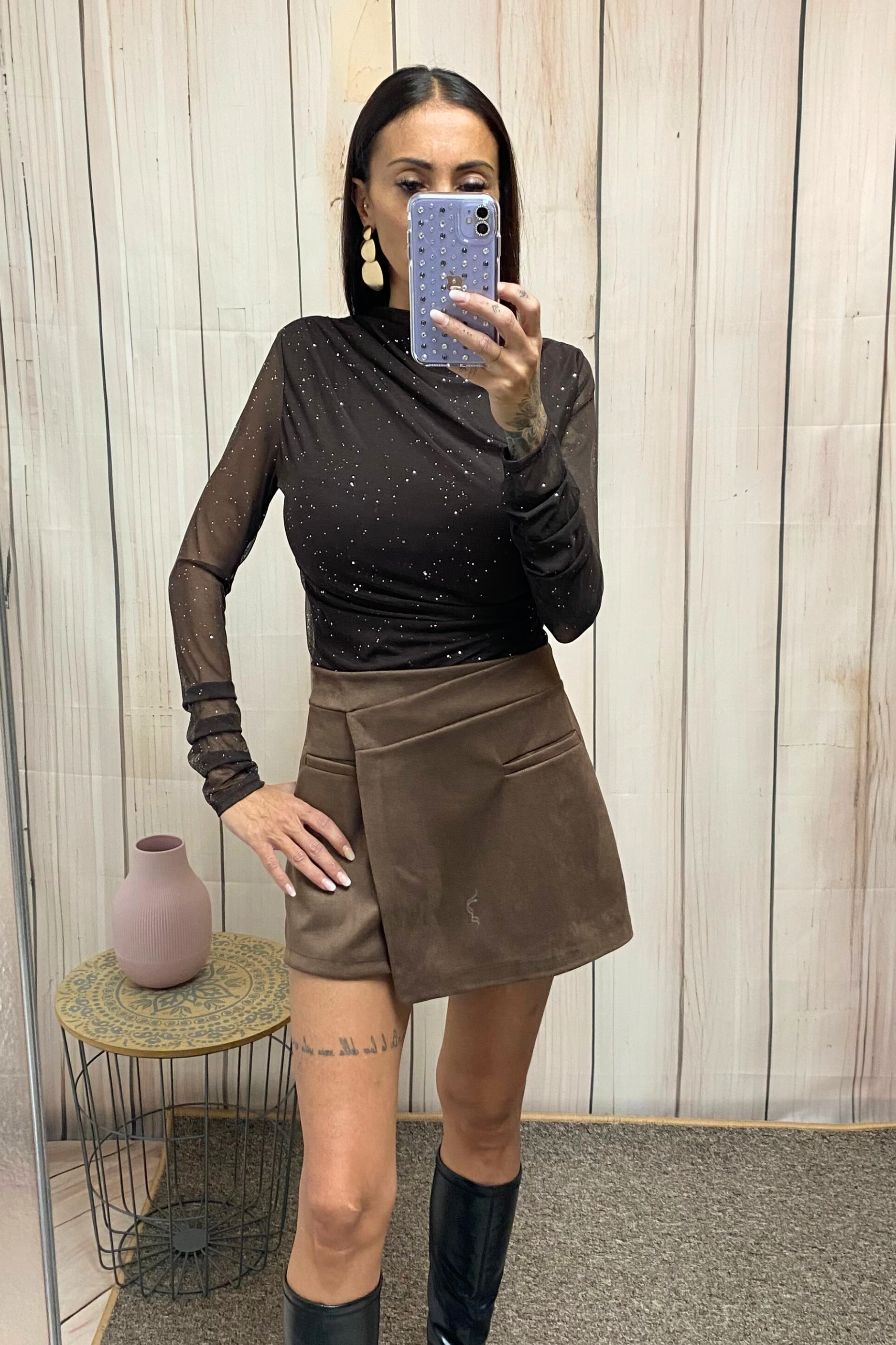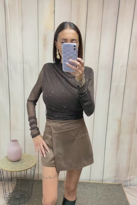 Este jersey de talla única combina elegancia y actitud moderna. Confeccionado en tejido mesh semitransparente, suave y elástico, se adapta cómodamente a distintas siluetas. Su base marrón está salpicada de destellos tipo galaxia que aportan brillo sutil sin exagerar. El cuello estiliza y las mangas largas añaden un toque sofisticado. Ideal para looks de día o noche, funciona perfecto con pantalones de tiro alto o faldas. Ligero, transpirable y versátil, eleva cualquier outfit con un aire contemporáneo y femenino. Disponible para combinar con capas, accesorios minimalistas y calzado urbano o elegante, siempre actual.