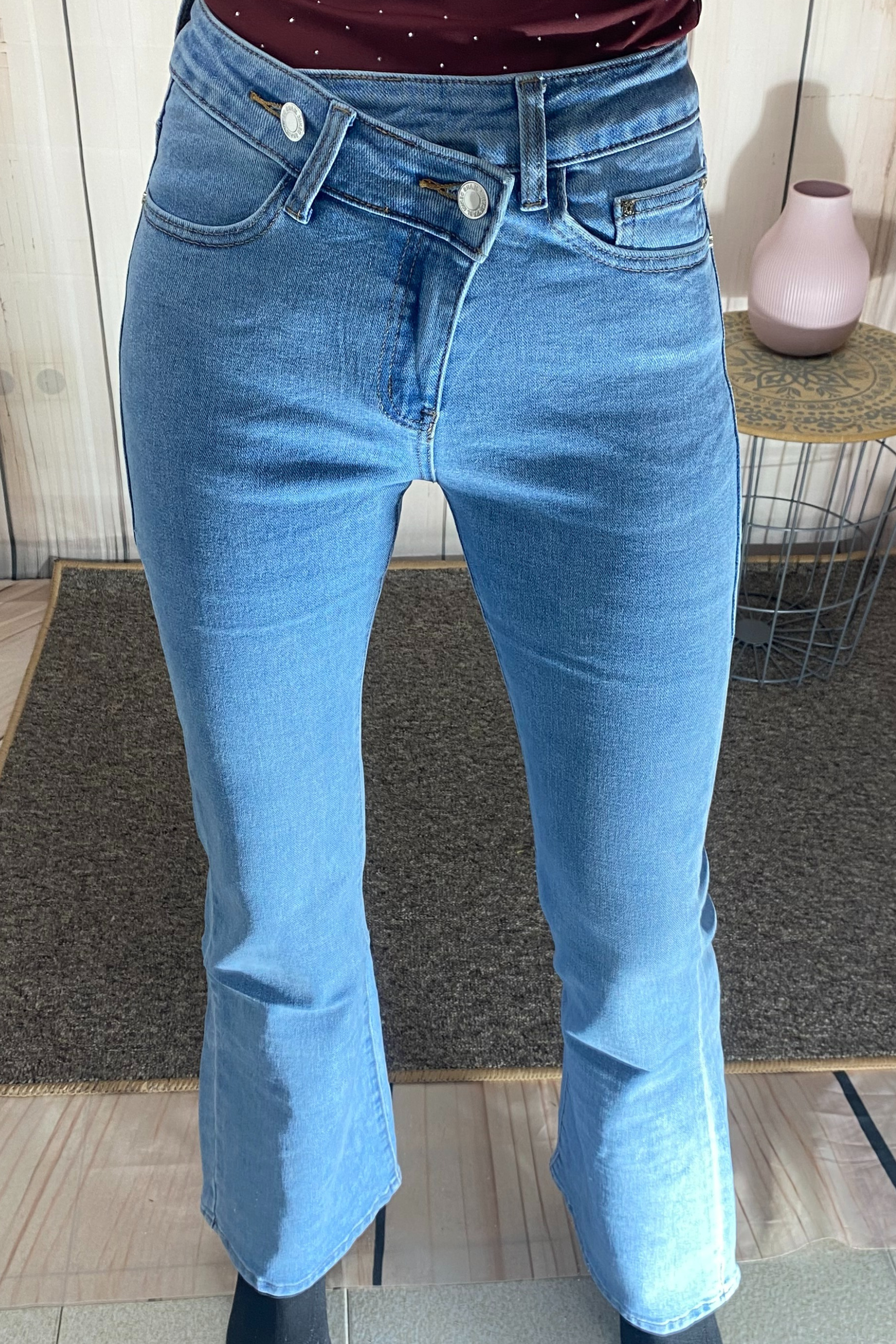 Vaquero Dual Button Fit, una prenda actual y favorecedora pensada para estilizar la figura. Confeccionado en denim suave y elástico de alta calidad, destaca por su original cierre frontal con doble botón, que aporta un toque moderno y diferente. Su cintura media-alta se adapta cómodamente al cuerpo, realzando la silueta sin oprimir. Pernera ligeramente acampanada que equilibra las proporciones y alarga visualmente la pierna. Un diseño versátil, ideal para combinar tanto con looks casuales como más sofisticados. Un básico renovado que no puede faltar en tu armario esta temporada. Disponible en tallas de la 36 a la 44.