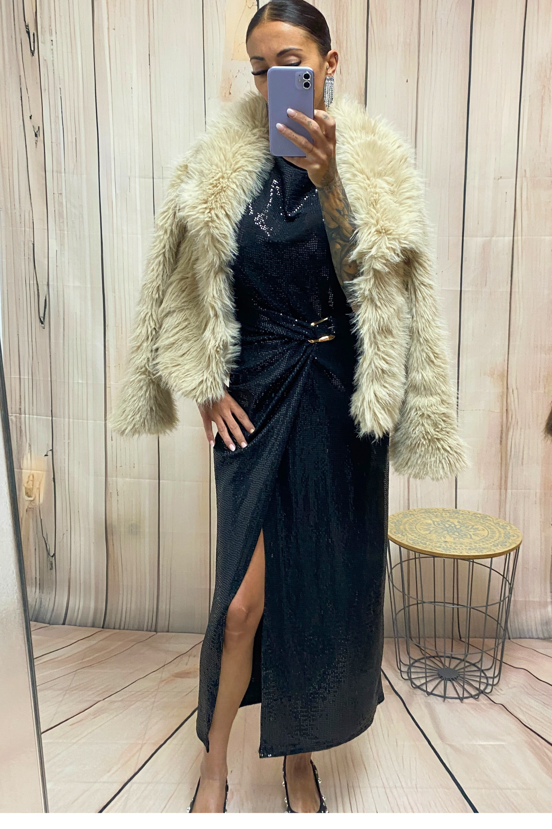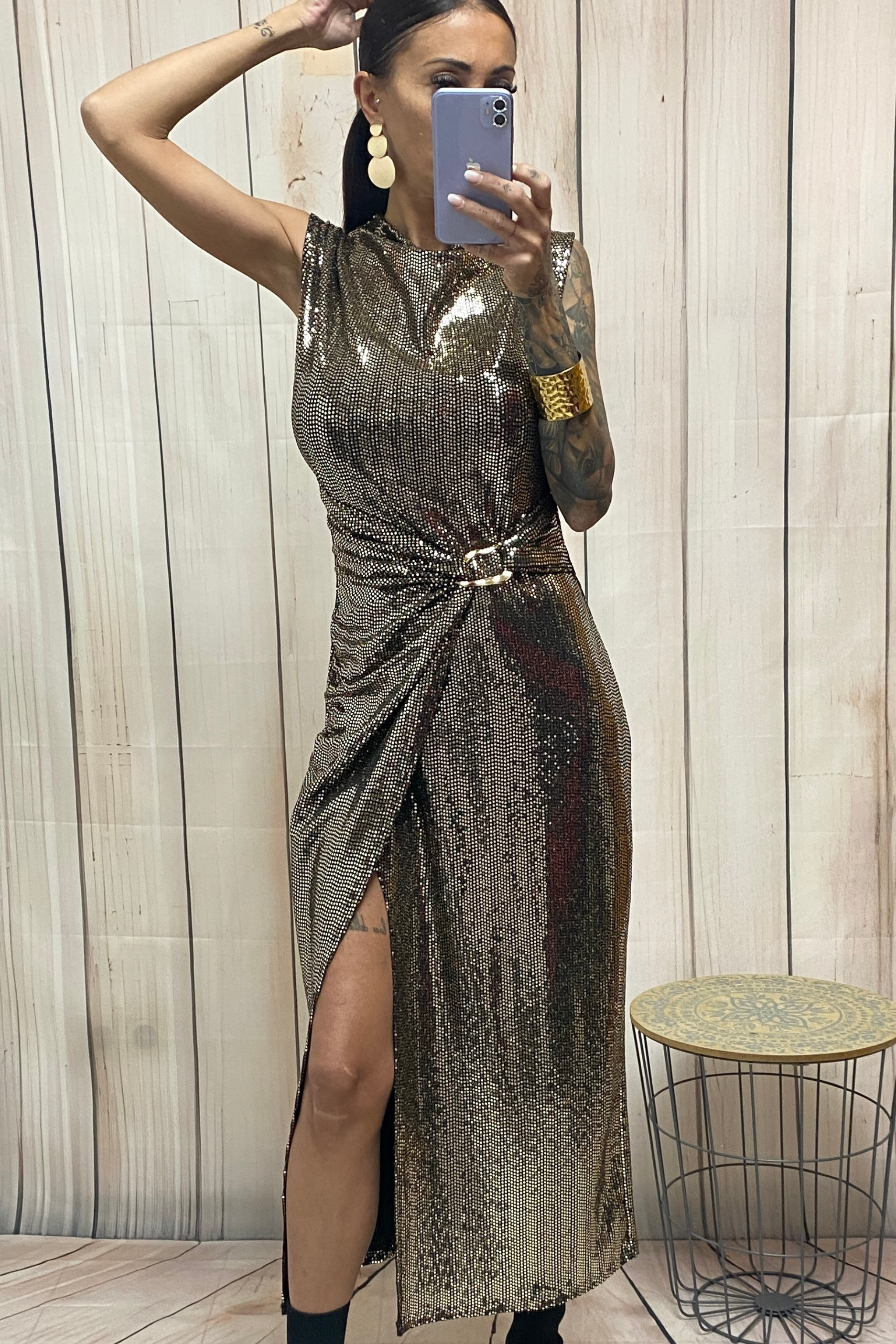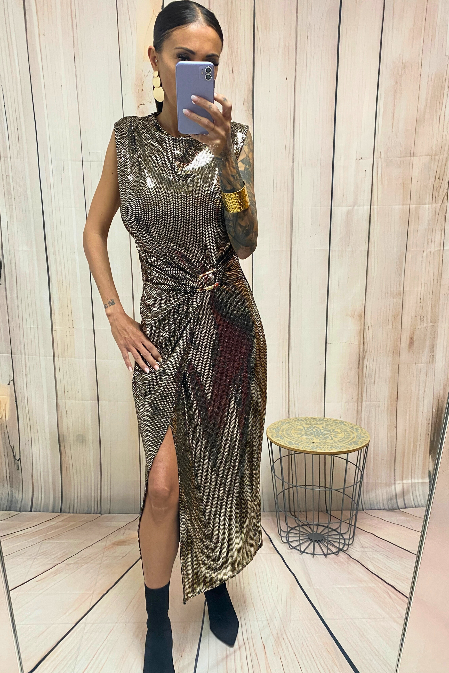 El Golden Impact es un vestido diseñado para deslumbrar en cualquier ocasión especial. Su tejido metálico elástico crea un efecto brillante espectacular, adaptándose perfectamente al cuerpo gracias a su talla única que va desde la 34 hasta la 42. Presenta un elegante cuello cerrado, hombros rectos y un fruncido lateral con hebilla dorada que realza la cintura y aporta un toque sofisticado. La abertura delantera añade sensualidad sin perder elegancia. Disponible también en negro, es ideal para fiestas, cenas o eventos donde quieras ser el centro de todas las miradas. Un vestido potente, glamuroso y lleno de actitud.